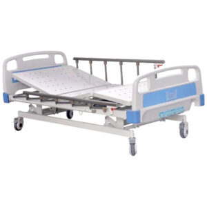 Catre clínico manual 3 funciones. Regula posición angular de Cabecera y Piernas y altura a través de tres manivelas, una para cada movimiento. Barandas colapsables. Fabricado en acero y polipropileno. Lecho ventilado.